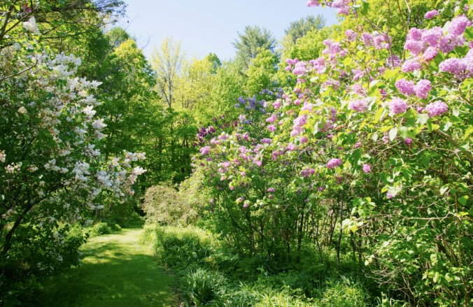 The formal garden features mature collections of hostas, daylilies, astilbes, iris, phlox, sedum, actea racemosa, sempervivums, and over 200 lilacs beneath a canopy of mature deciduous and coniferous trees. A diverse collection of Maine wildflowers and ferns border an old lane which rises up a wooded hill behind the barn.